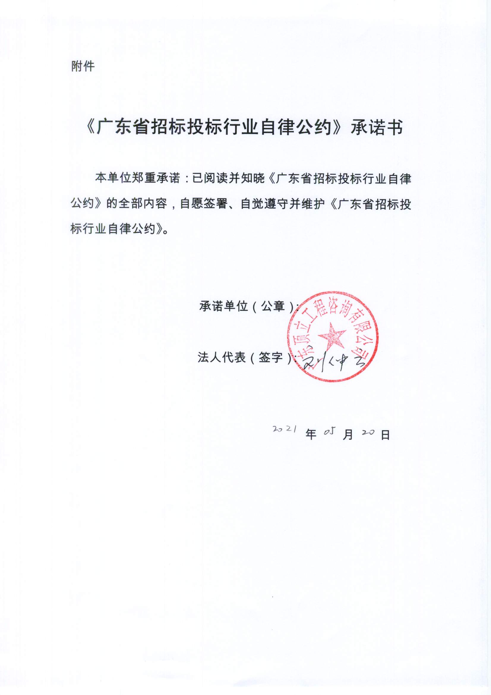 《广东省招标投标行业自律公约》 承诺书