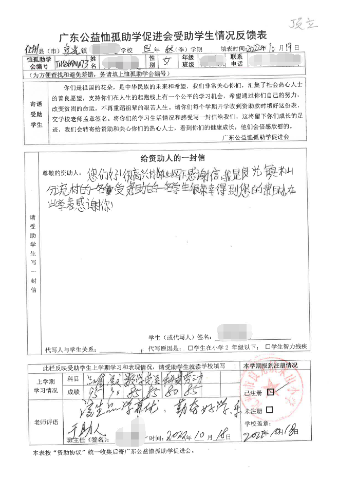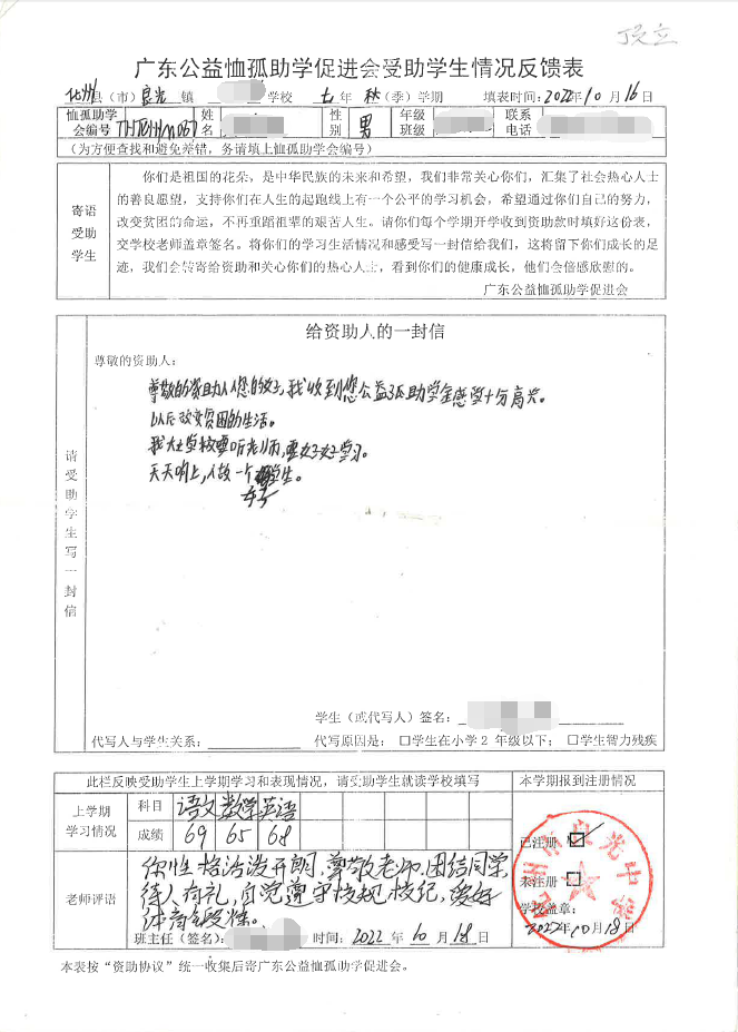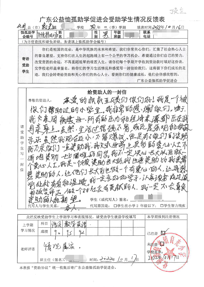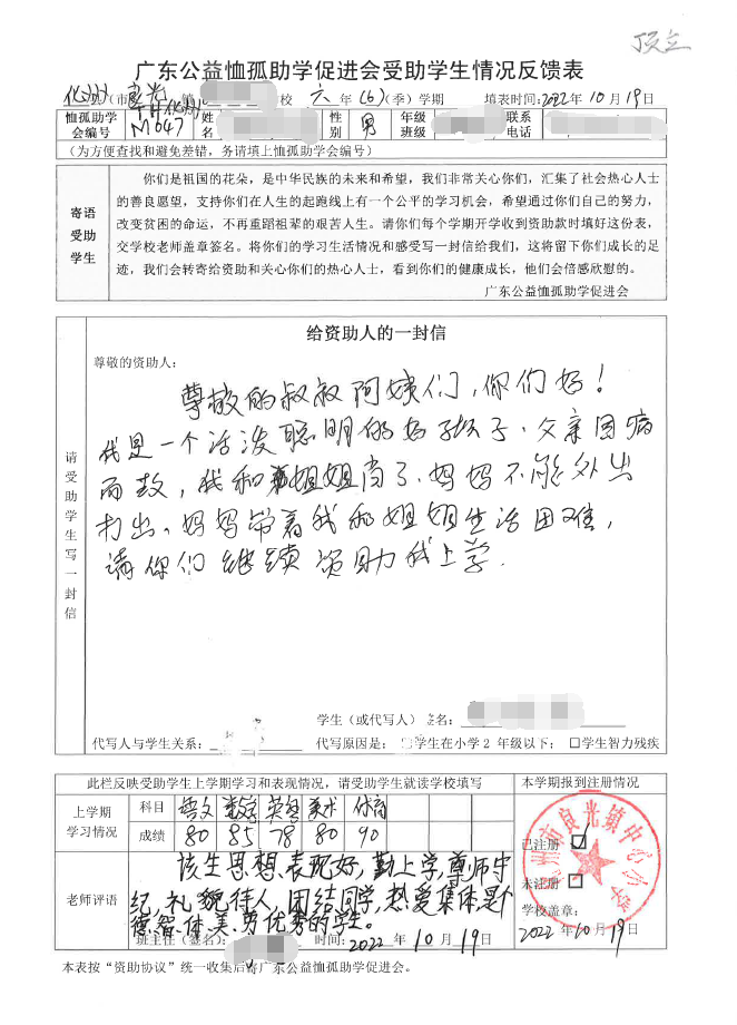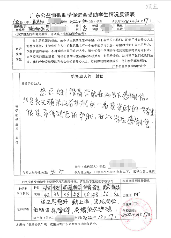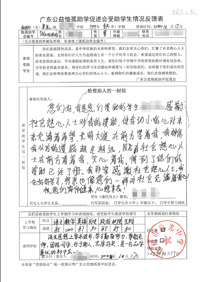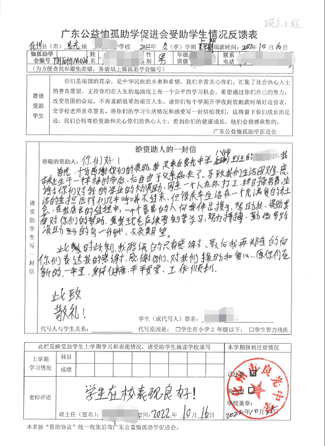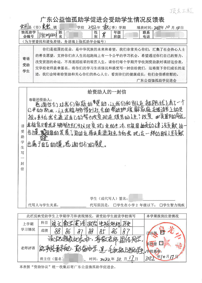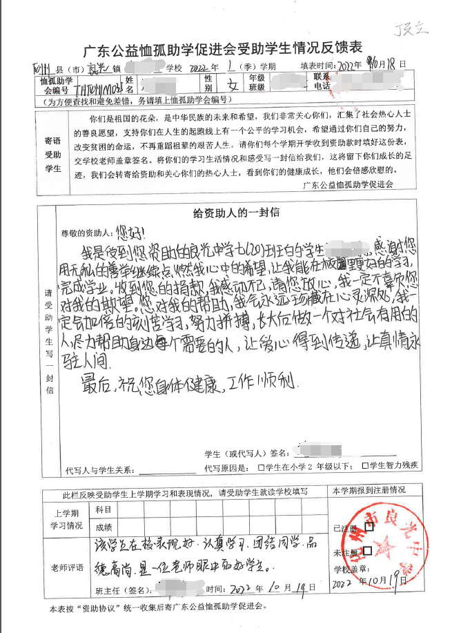 2022年7月,公司了解到广东公益恤孤助学促进会举办慈善助学活动之后,发起了公司内部慈善捐款活动,员工们积极参与,纷纷捐款,向有需要的学生奉献爱心,向他们表达一份关爱。也许我们的爱心微不足道,但却缓解了他们在学业上一定程度的经济压力,改善了他们的学习和生活环境,也给他们带来了希望。近期,广东公益恤孤助学促进会将学生情况反馈表及受助学生对捐助人的一封信邮寄到公司,反馈了受助学生的学习生活情况,反馈表及信函里记录着受助学生对学习的热爱,也表达着他们对捐助人的感激之情,可以说我们小小的举动给他们带来了莫大的支持。